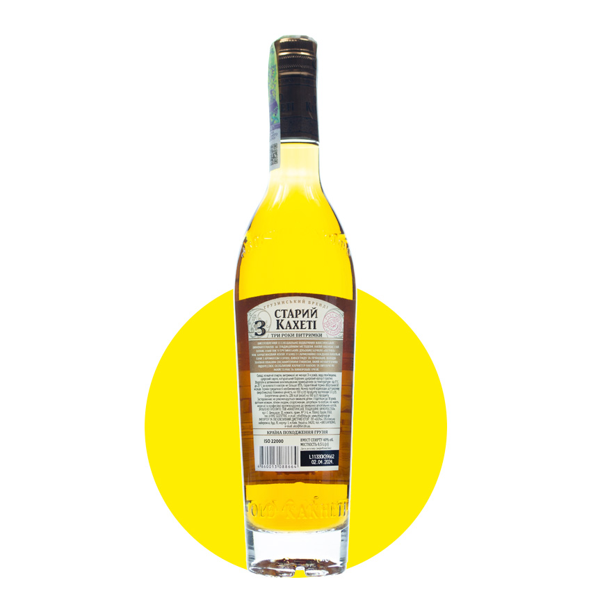 Бренді "Старий Кахеті" 40% 3* - Грузинський бренді трирічної витримки з ароматом сухофруктів, дубу та спецій. Має м'який і гармонійний смак з тривалим післясмаком. Рекомендовано для вживання в чистому вигляді або з льодом.