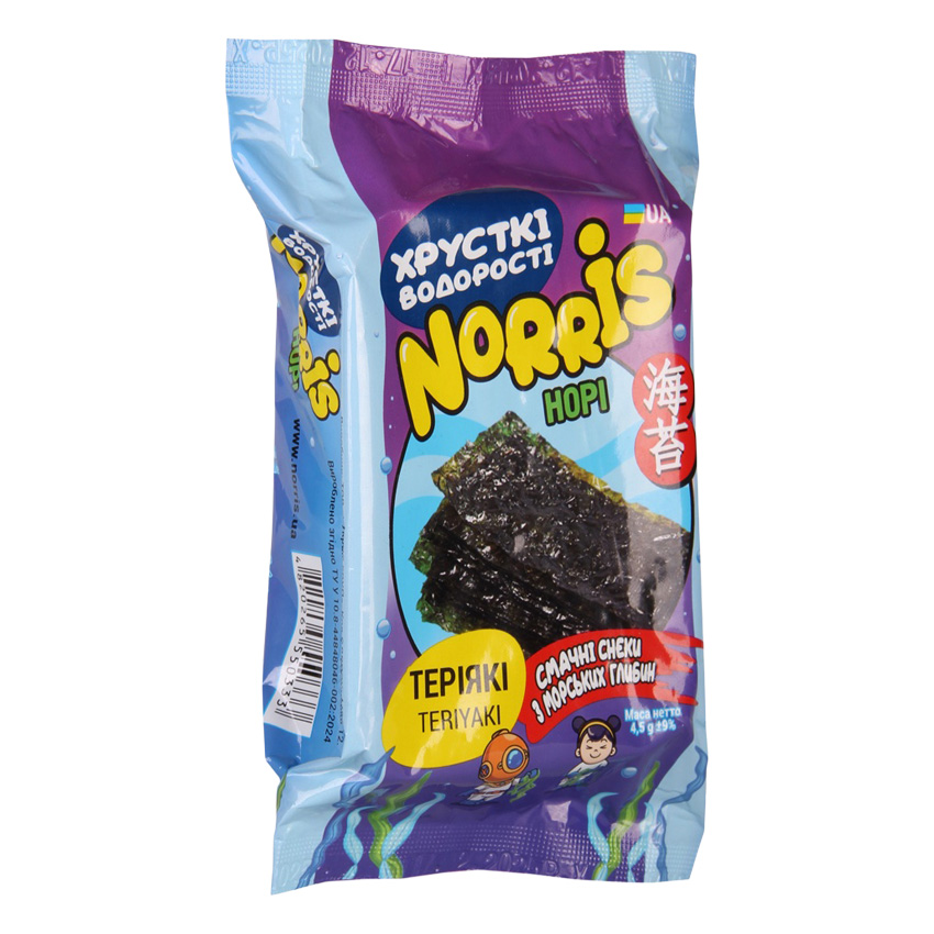Нори «Norris» со вкусом териака, 4,5 г – это хрустящая закуска из тонких обжаренных листьев морских водорослей, приправленных характерным сладко-соленым соусом териака. Выделяются насыщенным умами-вкусом с легкими карамельными и соевыми нотами, создающими гармоничный и выразительный вкусовой профиль. Благодаря нежной хрустящей текстуре норы идеально подходят как самостоятельный снек или как оригинальное дополнение к азиатским блюдам и напиткам. Удобный формат 4,5 г позволяет взять их для быстрого перекуса в любой момент.