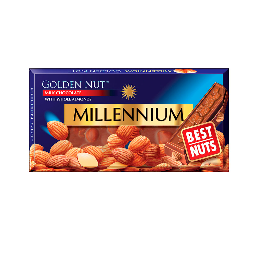 Шоколад «Millennium Gold» молочний з цілим мигдалем 100 г — це вишуканий десерт для тих, хто цінує класичний молочний шоколад у поєднанні з ароматними горіхами. Ніжна, кремова текстура шоколаду гармонійно поєднується з цілими ядрами мигдалю, створюючи насичений смак і приємну хрустку нотку в кожному шматочку. Ідеальний для перекусу, подарунка або як частина десертного столу, шоколад «Millennium Gold» пропонує поєднання високоякісного молочного шоколаду та натуральних горіхів у компактній упаковці 100 г. Купити шоколад «Millennium Gold» з цілим мигдалем варто тим, хто шукає солодку насолоду з багатим смаком і високою якістю інгредієнтів.